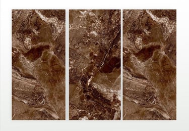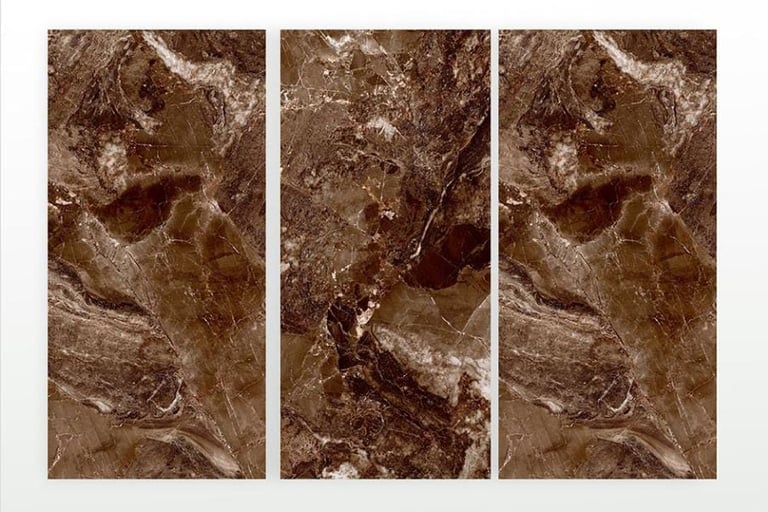 Aesthetic: Deep, polished brown marble look with classic white and beige fractured veining.