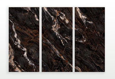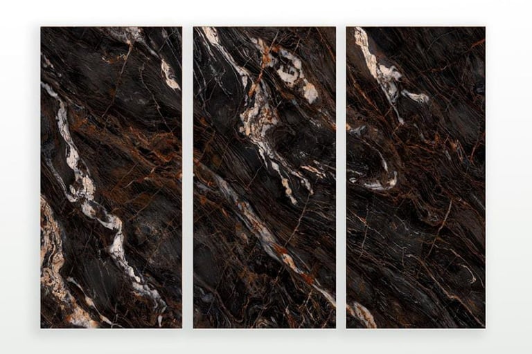 Aesthetic: High-contrast black marble with dynamic, sweeping white and metallic copper/gold veins, offering a mirror-like finish.