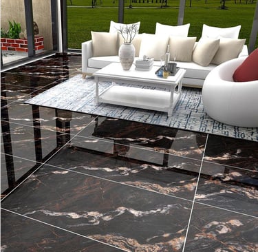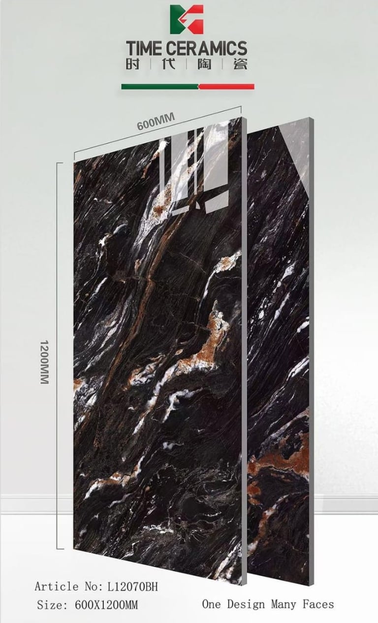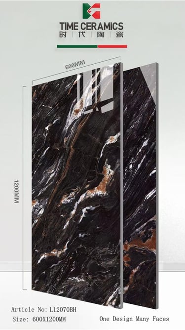 Create an atmosphere of unparalleled luxury and intensity with this high-gloss porcelain tile from TIME CERAMICS. This dramatic, large-format design features a deep black base cut through by explosive white, silver, and vibrant copper/gold veining. It delivers a stunning, polished look that commands attention.