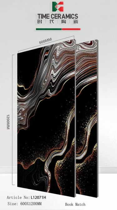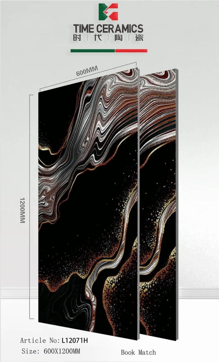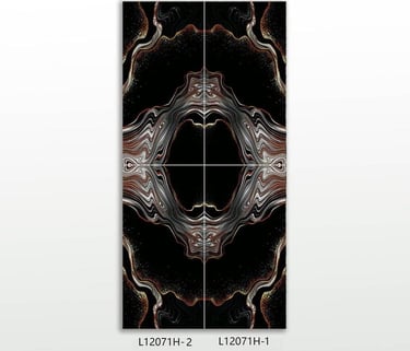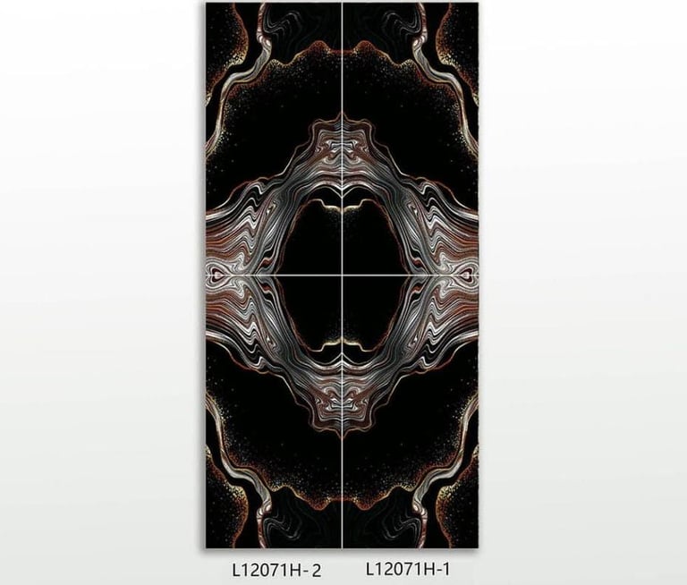 Make a breathtaking, artistic statement with this exclusive bookmatch porcelain tile from TIME CERAMICS. The high-gloss black canvas is swept with dynamic, fluid waves of metallic silver, white, and shimmering copper, creating a truly unique focal point. When two or four tiles are laid together, the mirror-image pattern forms a mesmerizing, symmetrical design that elevates any room to gallery status.