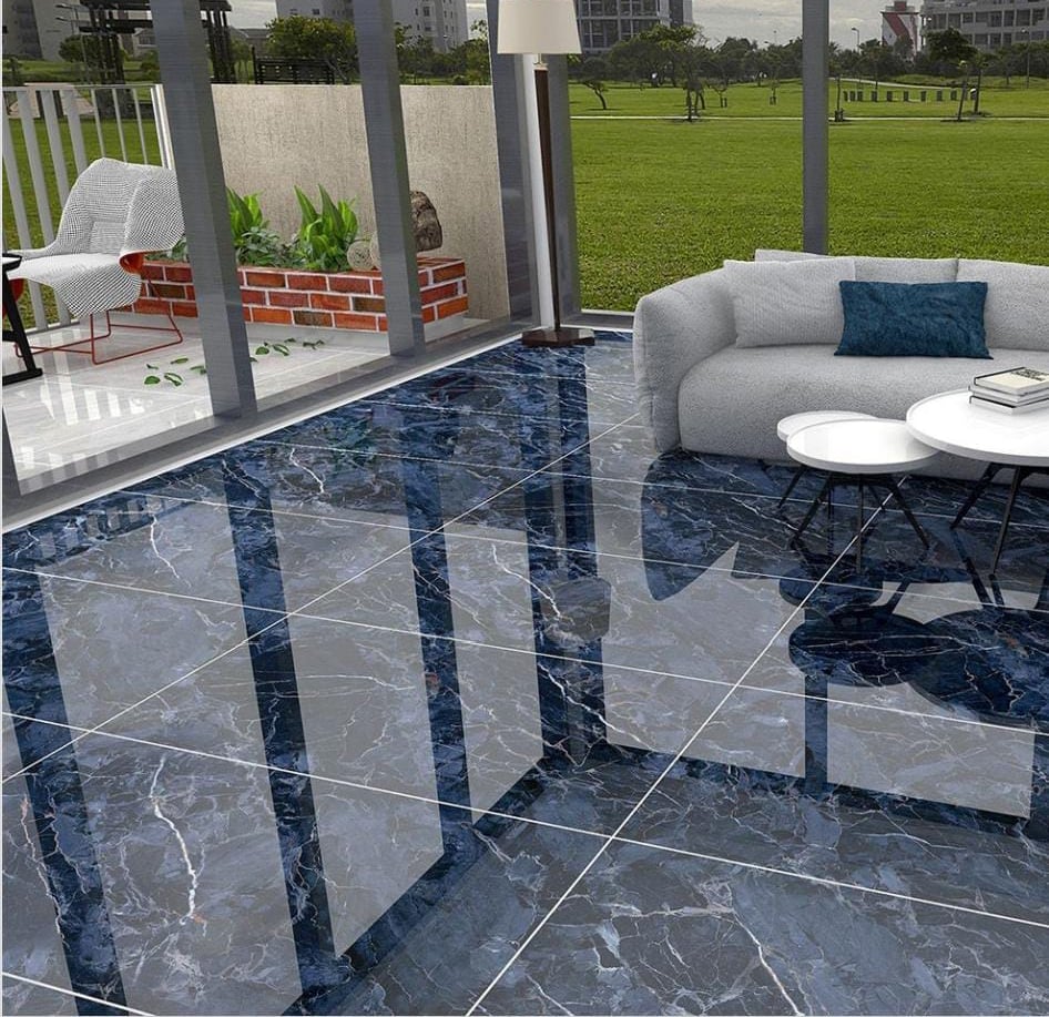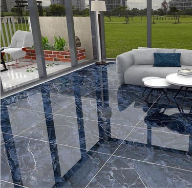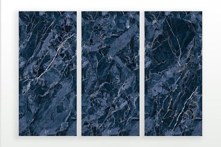 Aesthetic: Dramatic, high-contrast dark blue marble look with a brilliant, polished finish.