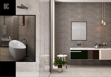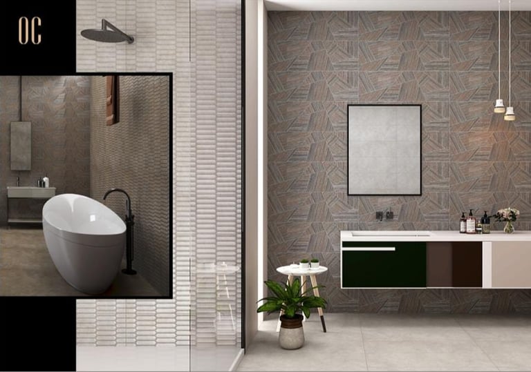 Design Note: Features a blend of rich, angular wood-effect decor and modern 3D geometric texture tiles.